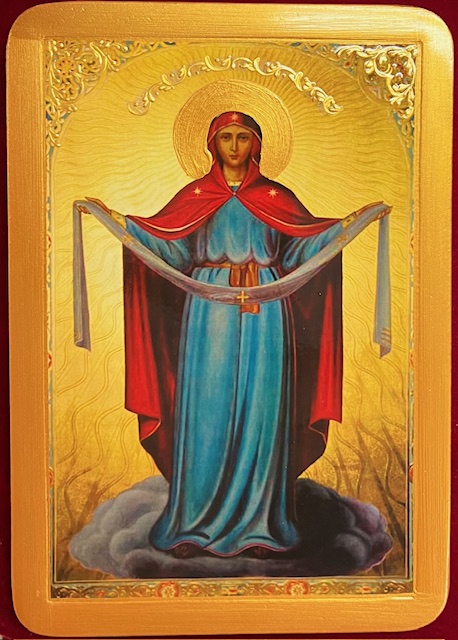 It is reproduced by an artist of St. Anthony workshop on a traditional wooden base and set in levkas (chalk-based natural glue) and gold background. It is in accord with the Byzantine style iconography.